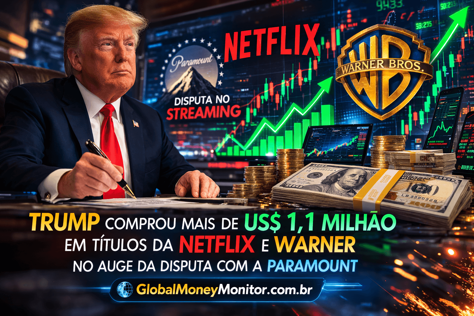 Uma revelação recente envolvendo o ex-presidente dos Estados Unidos, Donald Trump, movimentou o mercado financeiro e o setor de entretenimento global. Documentos divulgados pelo governo americano indicam que Trump comprou mais de US$ 1,1 milhão em títulos das empresas Netflix e Warner, em um período marcado por forte disputa no mercado de streaming envolvendo a Paramount.